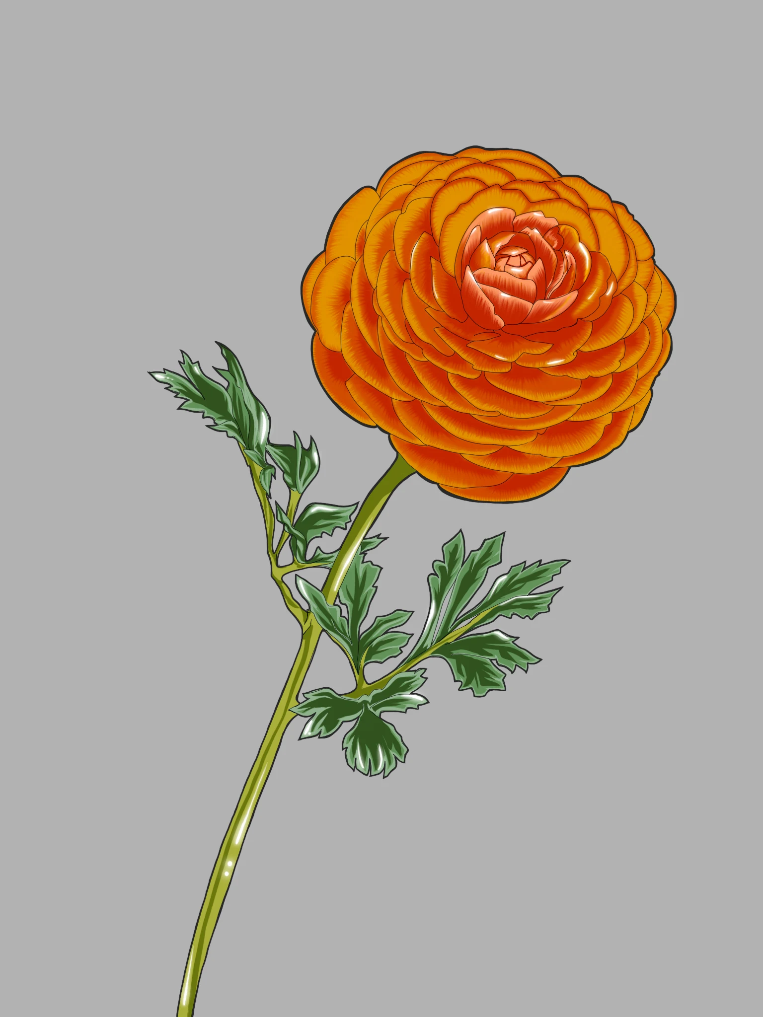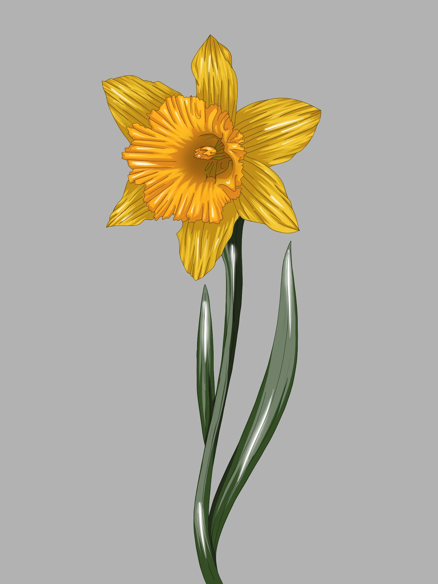 A vibrant yellow daffodil with six elongated petals and a trumpet-shaped center. The flower has a tall, slender green stem with pointed leaves.
