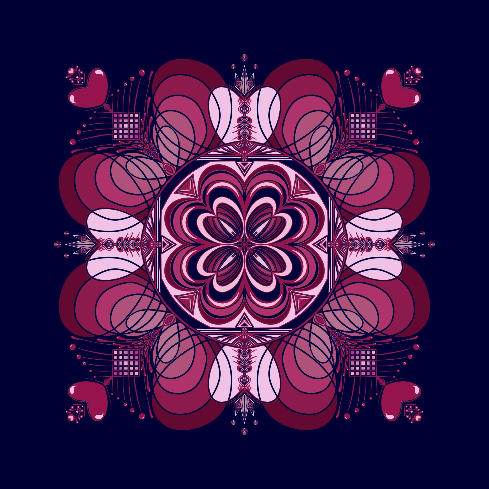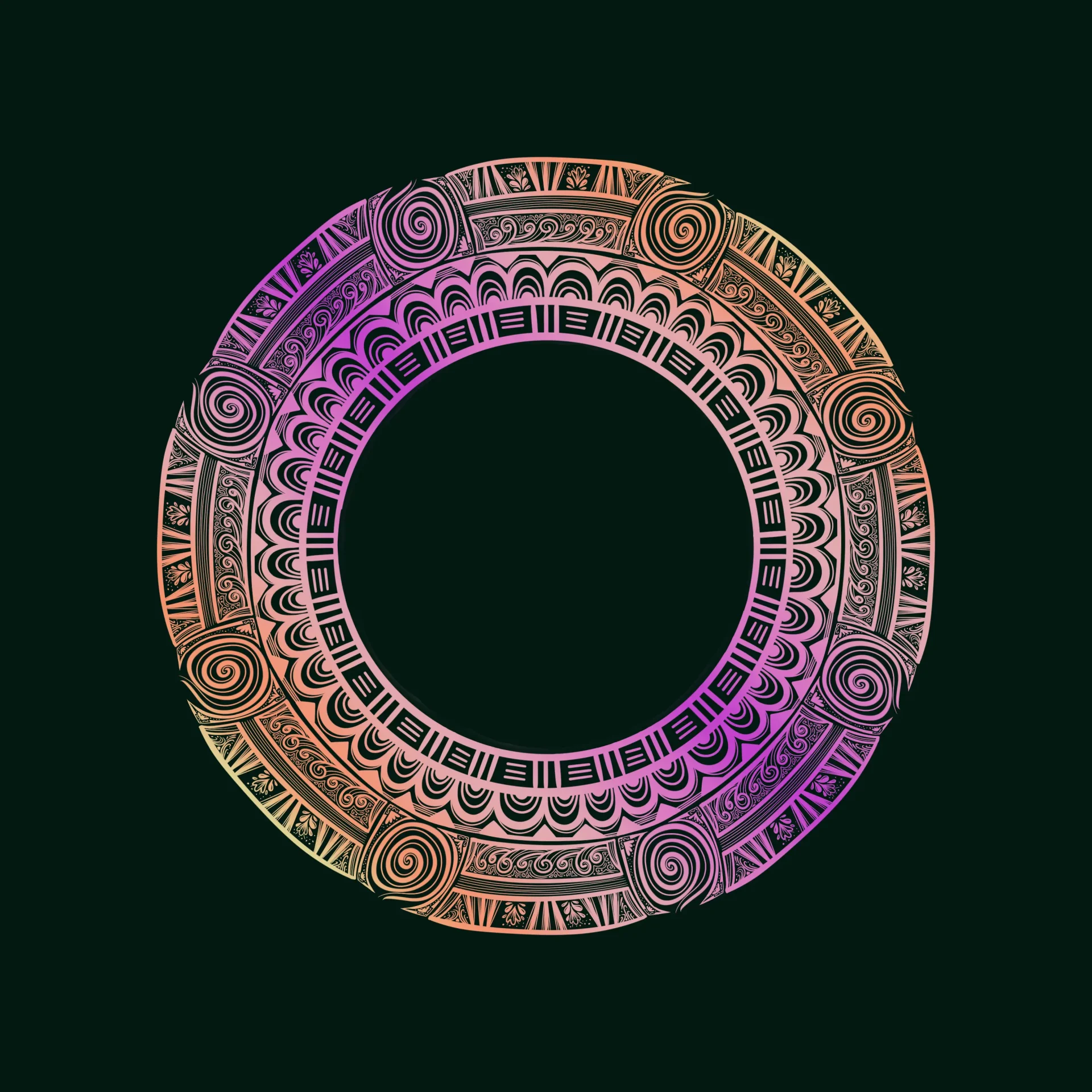 A circular border mandala with a gradient of orange, pink, and purple on a dark green background. The pattern consists of spirals, geometric shapes, and ornamental detailing, leaving the center open.