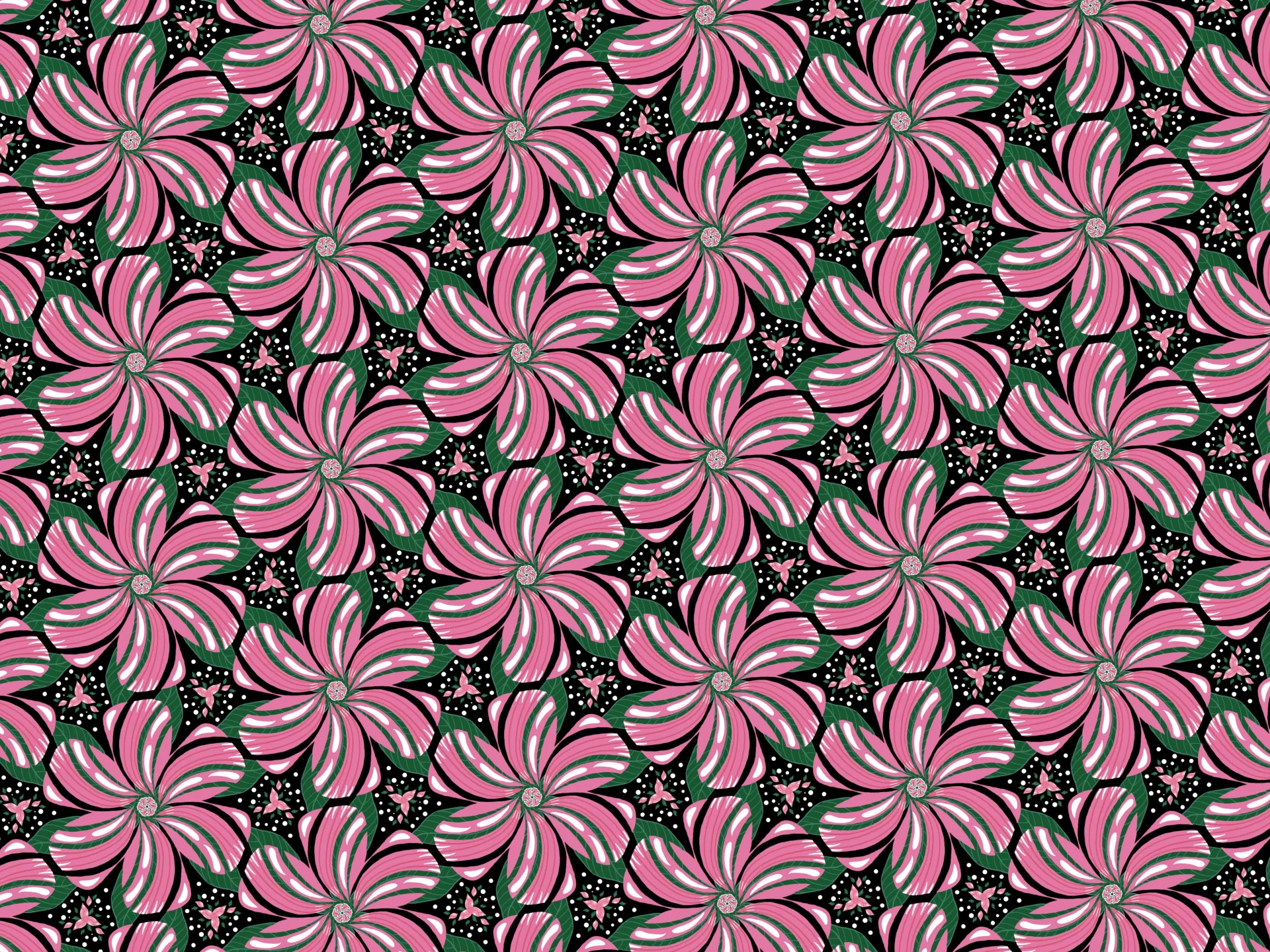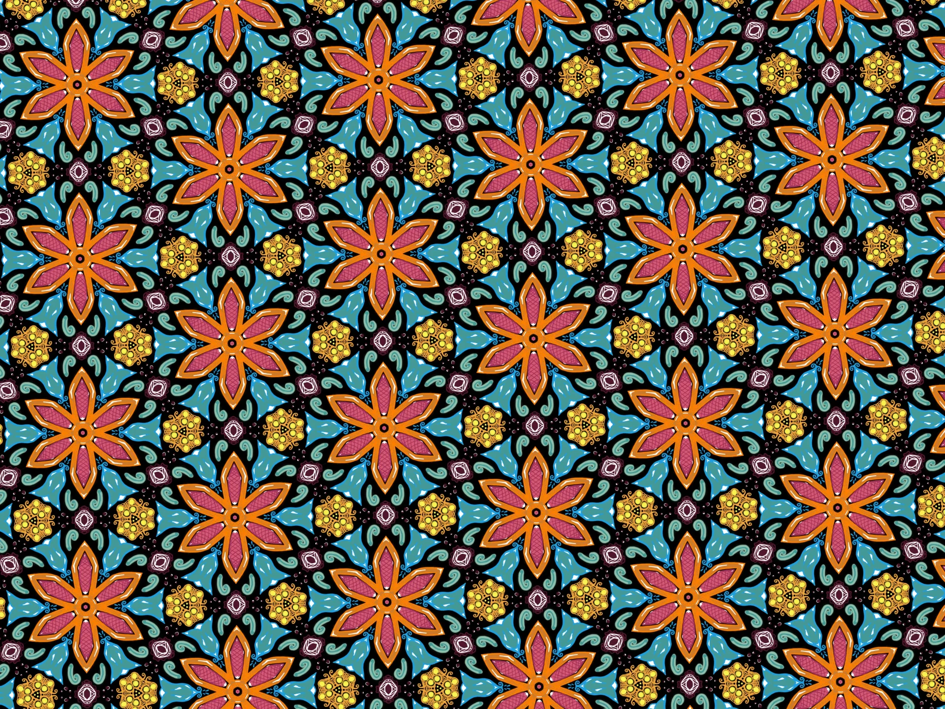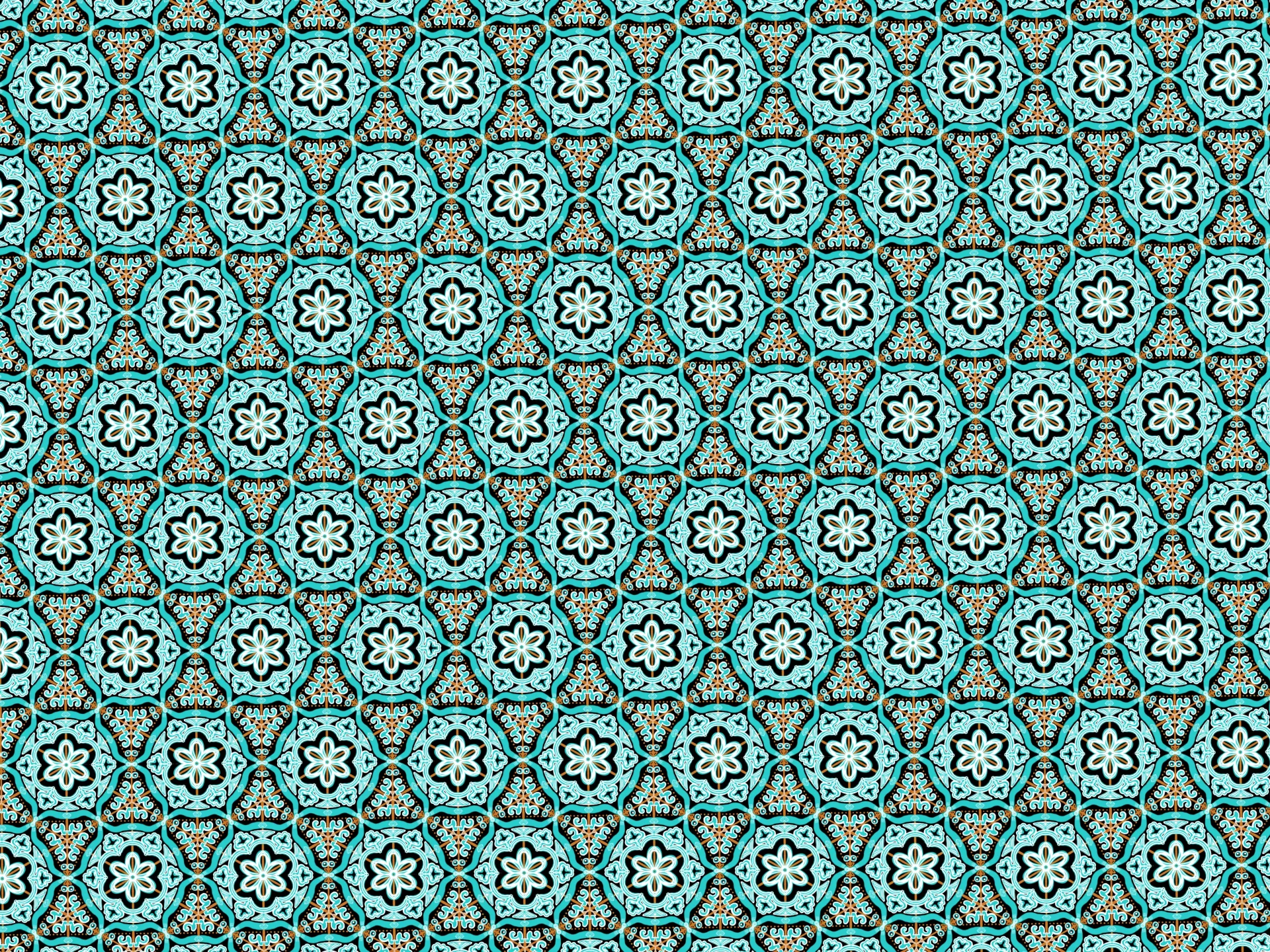 Light turquoise floral motifs repeat symmetrically, outlined with black and accented by burnt orange details. The interconnected shapes create a vintage, tiled aesthetic on a clean black background.