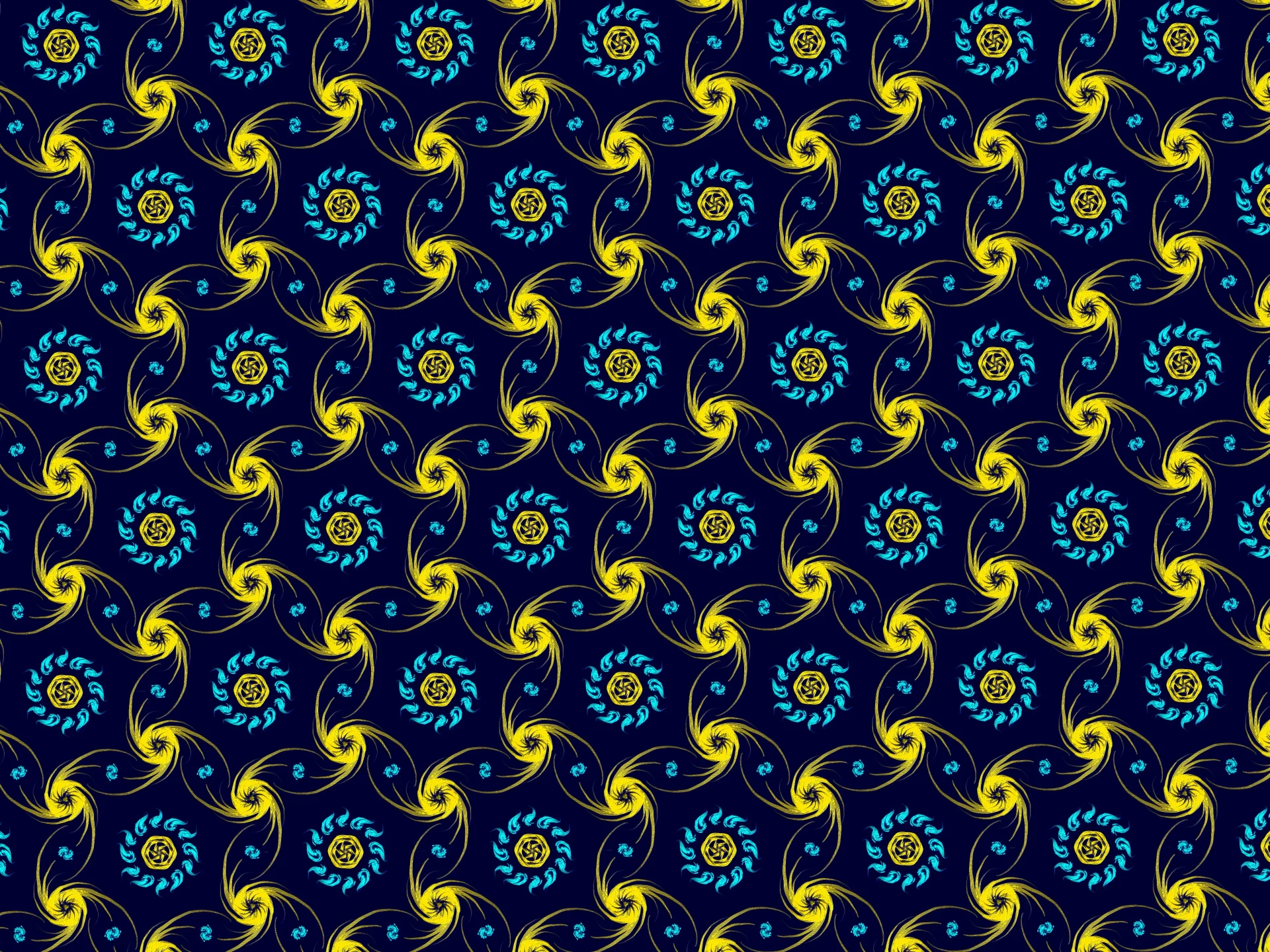 Circular motifs featuring bright yellow and blue floral elements are evenly spaced on a dark blue background. Each motif is surrounded by swirling yellow lines, adding flow to the arrangement.