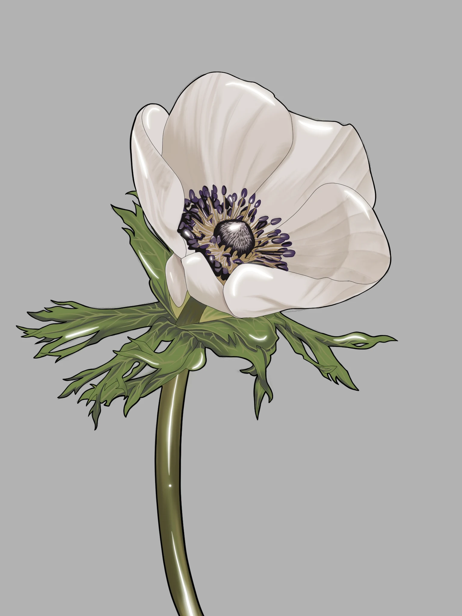 A soft white anemone flower with smooth, rounded petals and a dark purple-black center surrounded by stamens. The stem is slender and green, with jagged green leaves near the base of the flower.