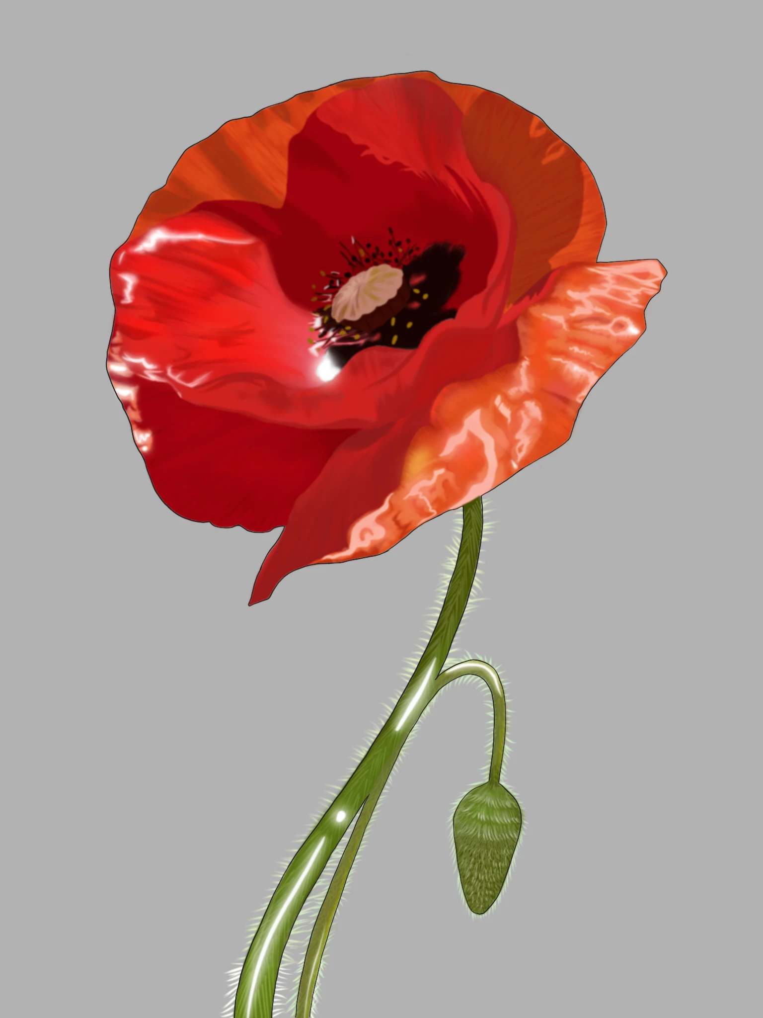 A bright red poppy flower with delicate, crinkled petals and a dark center. The green stem is slightly curved, with fine hairs along its surface. A small, unopened green bud hangs from the stem below the flower.