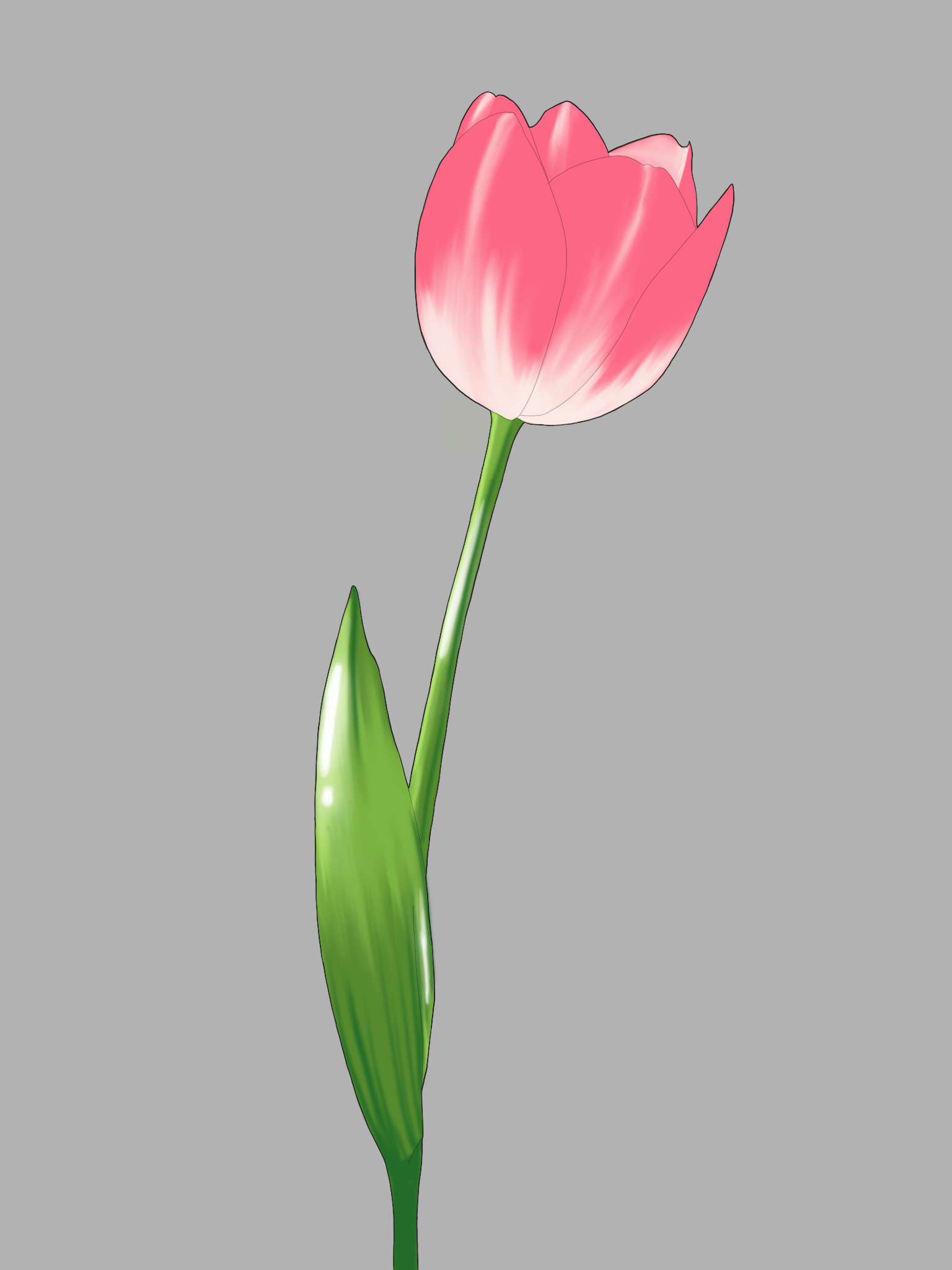 A simple and elegant pink tulip with smooth, curved petals. The flower stands on a single, smooth green stem with one long, tapered leaf.