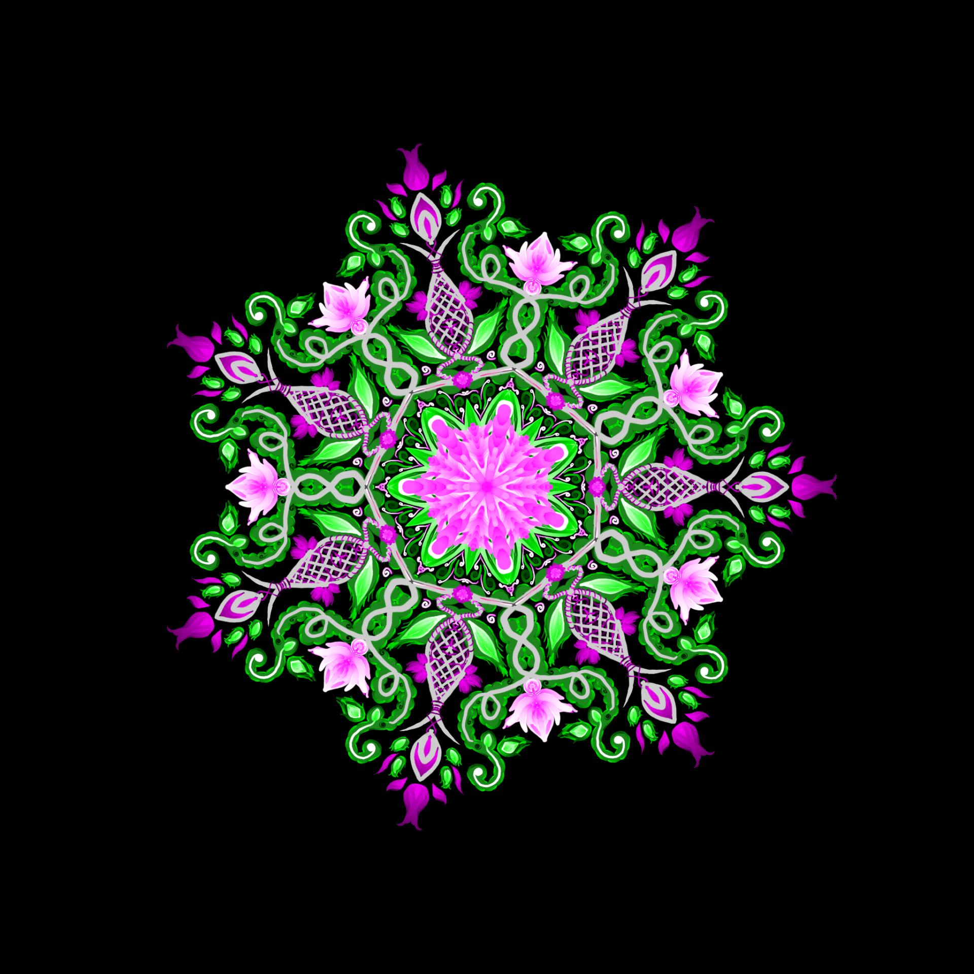 A turquoise and mint-green mandala with intricate details on a dark blue background. The design features floral elements and delicate curving lines that evoke a calming and harmonious atmosphere.